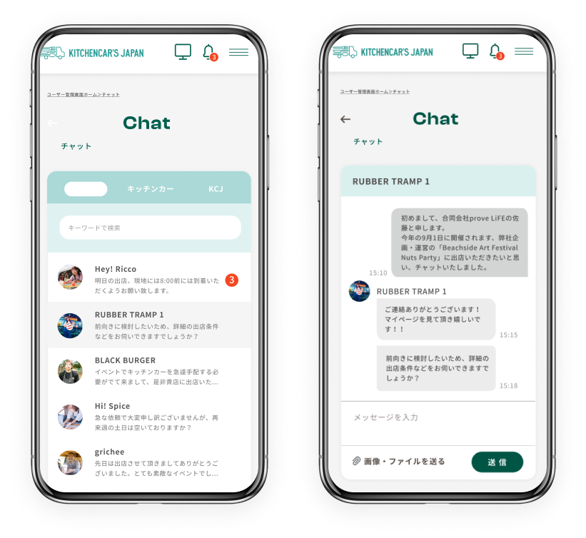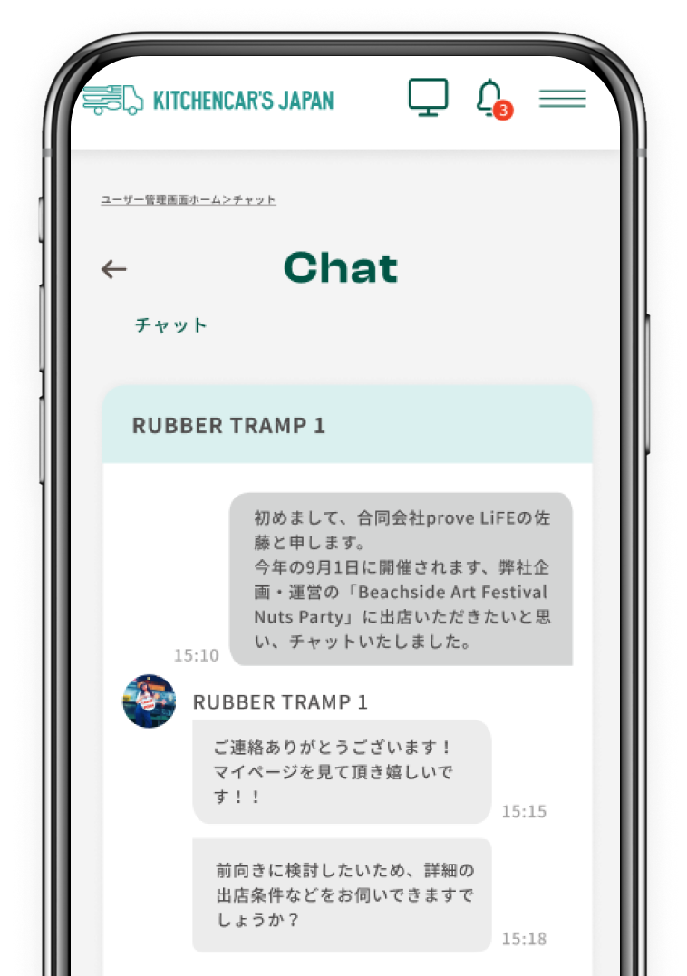 A.会員登録後、キッチンカー専用の管理ページから募集中のイベントに応募できます。主催者から直接メールやチャットでオファーが届く場合もあります。