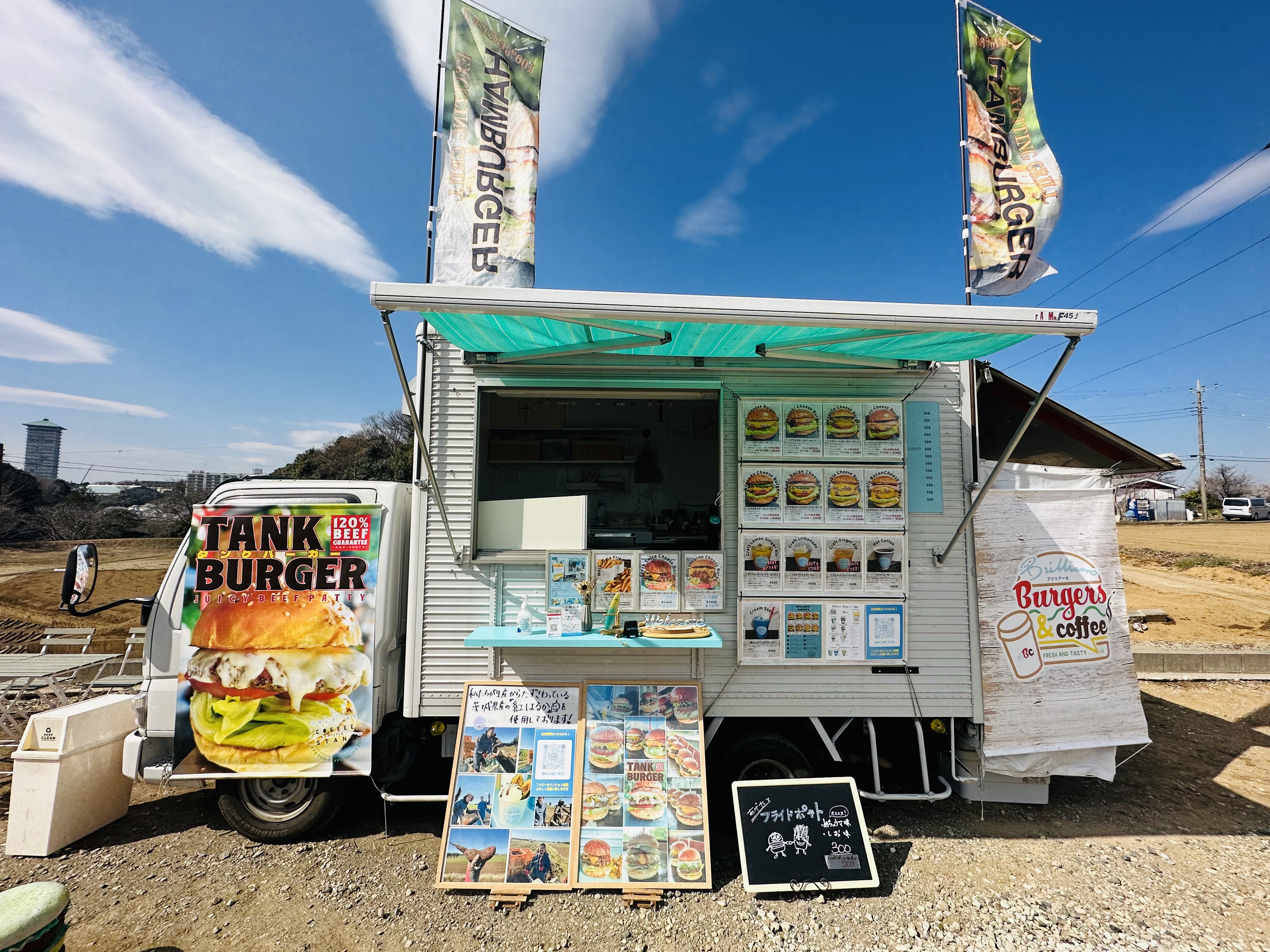 ハンバーガー、コーヒー、レモネード、アイスやきいもブリュレ、やきいもビーフドッグ