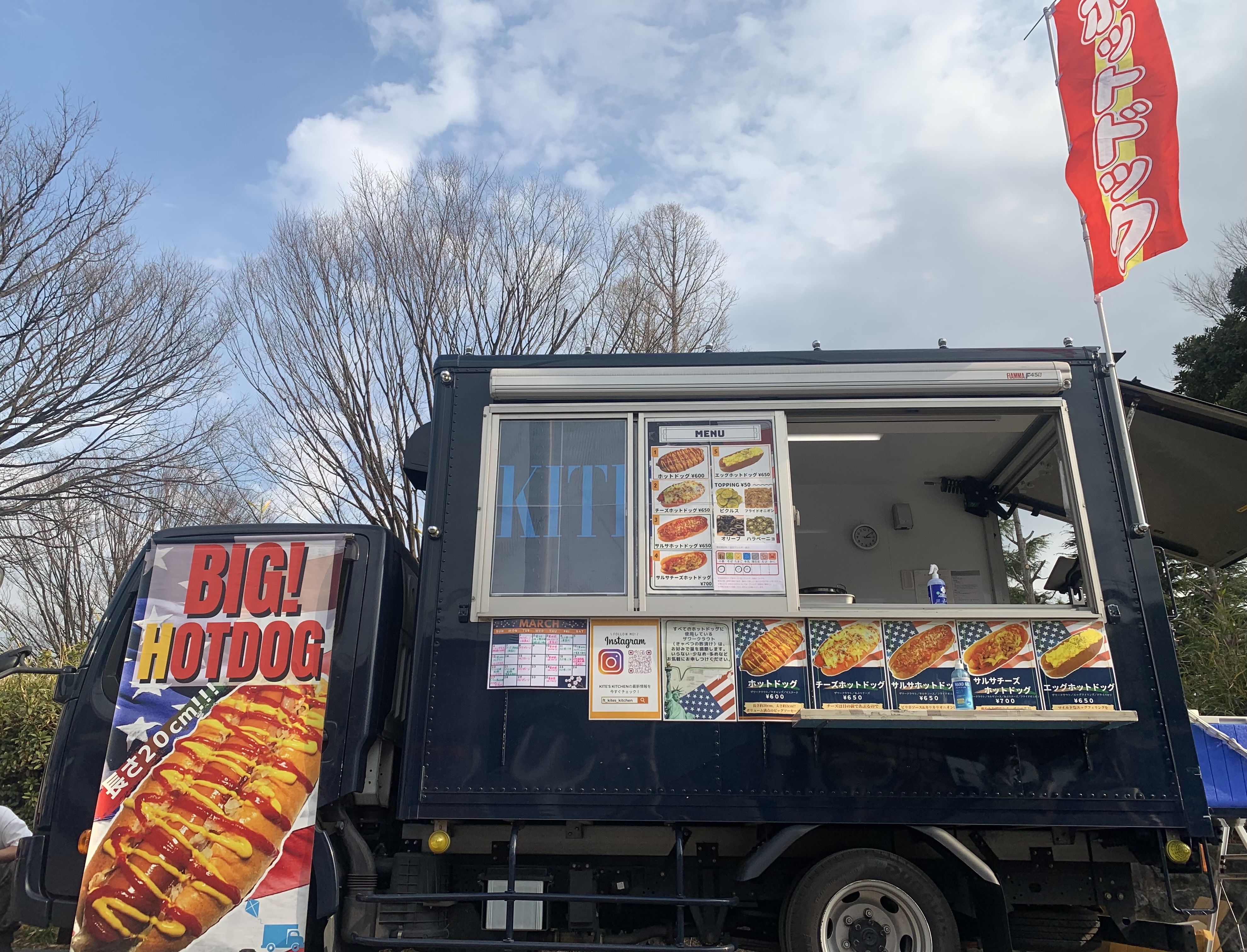 カイトズキッチンの提供するホットドッグは、長さ約20㎝・太さ約2cmととにかくソーセージがでかい!