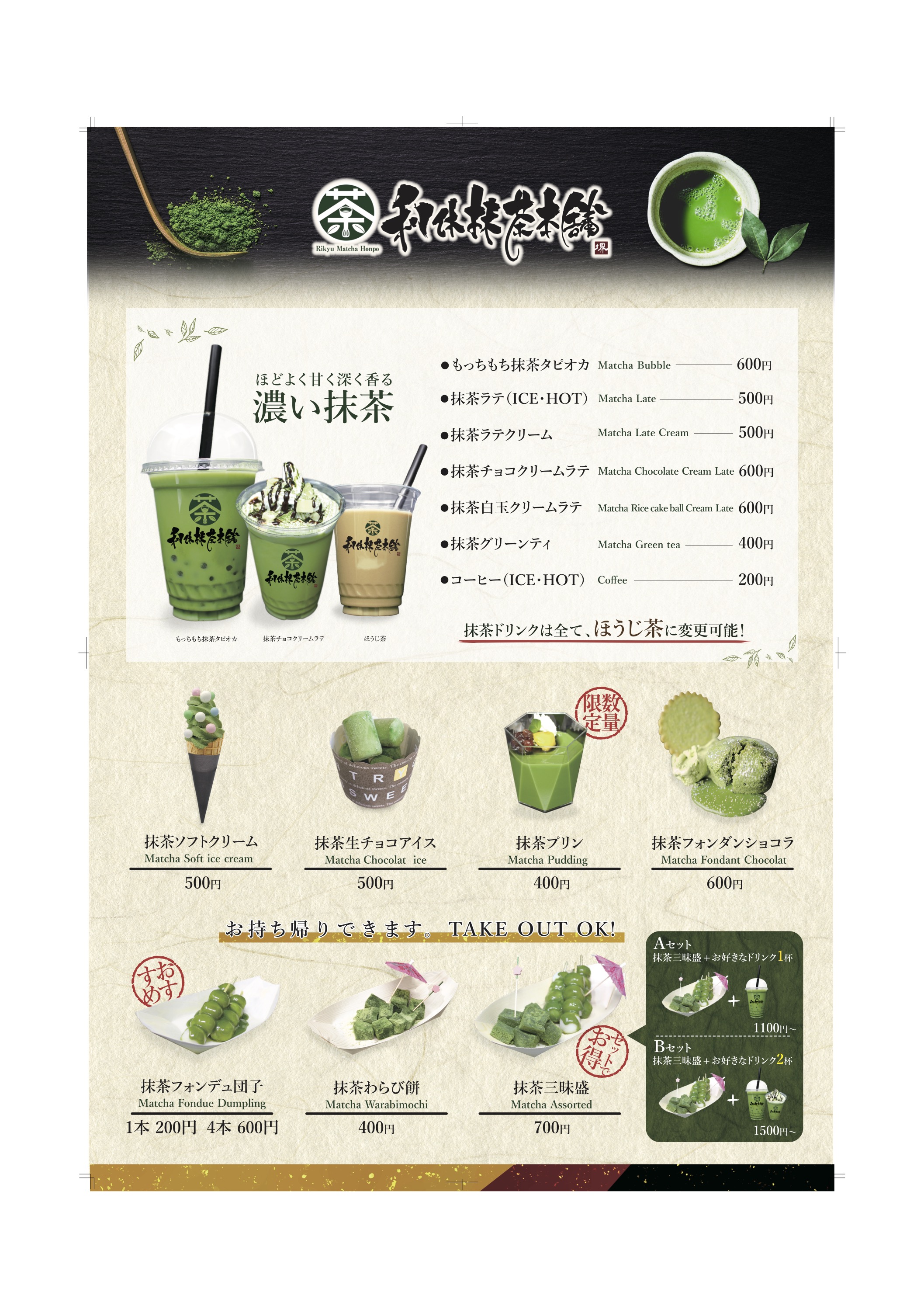 ドリンク類は全てほうじ茶ラテにも変更可能で2種類のテイストが楽しめます。