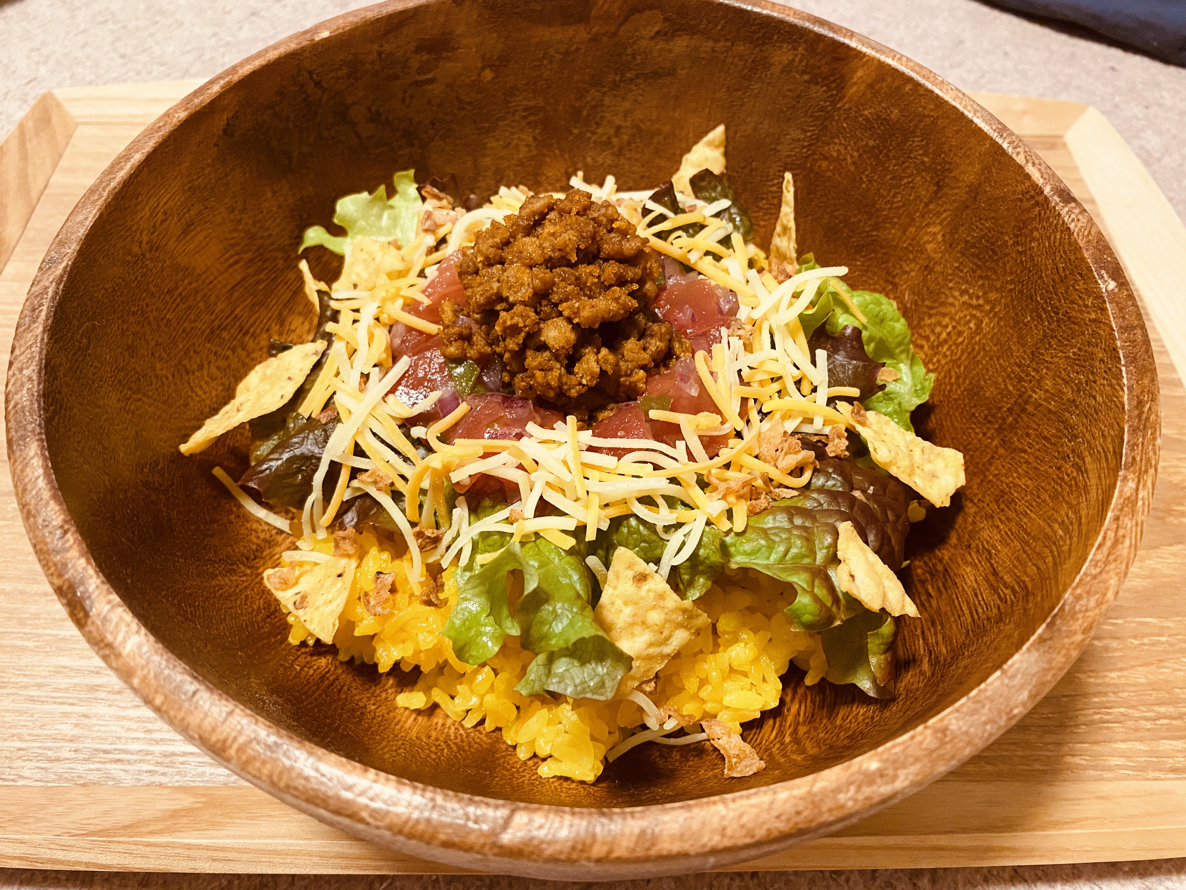 特製タコミートとフレッシュトマトのサルサソースをサフランライスにのせました。