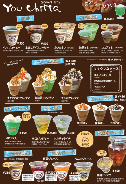 ドリップコーヒー 水出し カフェオレ アイスカフェオレ 抹茶オレ アイス抹茶オレ キャラメルマキアート アイスキャラメルマキアート 抹茶マキアート アイス抹茶マキアート ココア アイスココア ココアマキアート アイスココアマキアート クリームソーダメロン クリームソーダ ソルティライチ(水、炭酸) ジンジャエール とうもろこしのヒゲ茶 有機梅ジュース(水、炭酸) 野菜ジュースオレンジ 野菜ジュースむらさき りんごジュース 冷し焼き芋 ワッフル